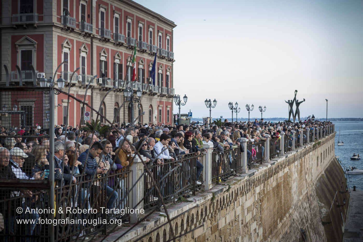 Taranto (TA) – Festa Patronale di San Cataldo -La tradizione vuole che la sera dell’8 maggio la statua argentea del santo esce in processione dal Duomo in città vecchia per prendere il largo su di una grande nave messa a disposizione della Marina Militare. Nello specchio del Mar Grande tante imbarcazioni, piccole e grandi, sono raccolte ad attendere ed a fare da scorta alla statua del santo. I fuochi d’artificio e le sirene delle barche salutano l’effige del santo al suo passagio in Mare: Dal mare Grande, attraverso il canale navigabile, per poi giungere nel Mar Piccolo, si rinnova simbolicamente la benedizione alla città, per fare infine rientro in città vecchia dove una nuova processione accompagnerà la statua sino al Duomo.