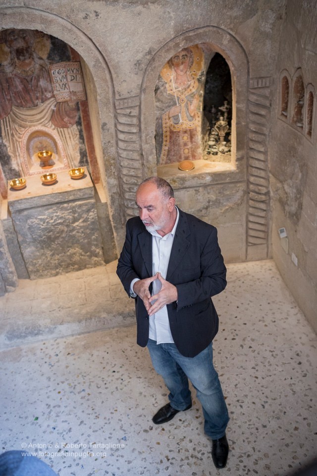 Mimmo Vestita all’interno del suo Museo della Ceramica di Grottaglie, la “Casa Vestita”. Qui siamo nella Chiesetta rupestre scoperta durante i lavori di ristrutturazione