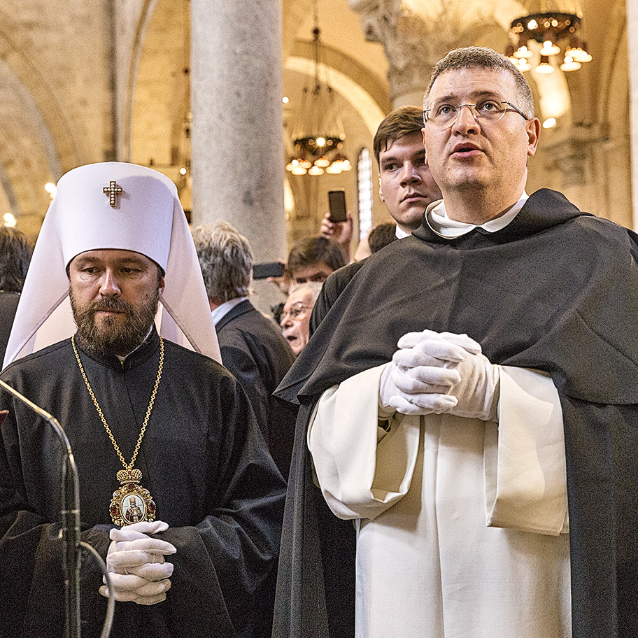 domenica 21 maggio 2017. Basilica di San Nicola, il metropolita Hilarion Alfeev, presidente del dipartimento delle relazioni esterne del Patriarcato di Mosca (a sx) con Padre Ciro Capotosto, priore.