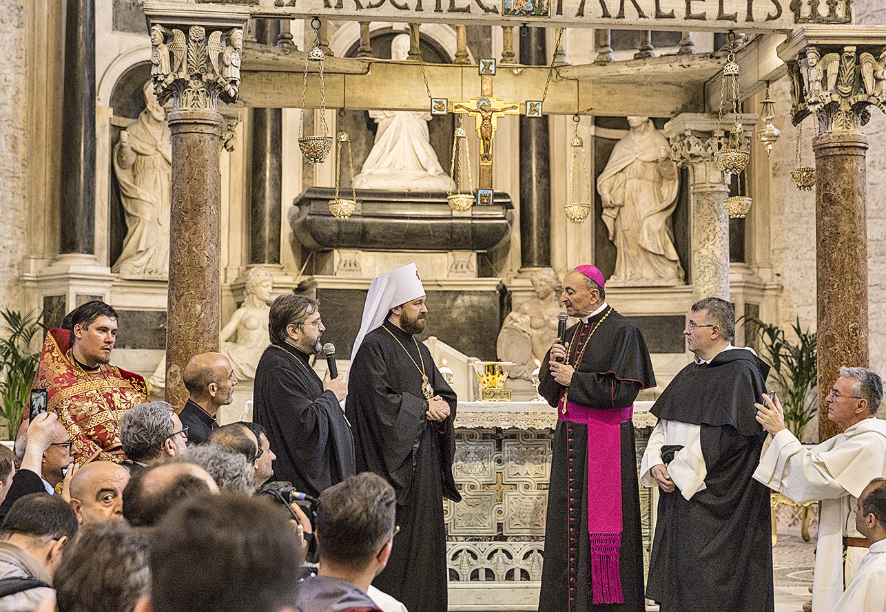 domenica 21 maggio 2017. Basilica di San Nicola, da sinistra: Padre Andrey Boytsov, Rettore della Chiesa Russa di Bari, il metropolita Hilarion Alfeev, presidente del dipartimento delle relazioni esterne del Patriarcato di Mosca, il Vescovo Francesco Cacucci, Padre Ciro Capotosto, priore della Basilica.