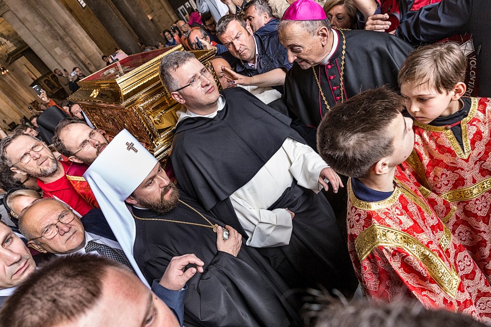 domenica 21 maggio 2017. Basilica di San Nicola, il metropolita Hilarion Alfeev, presidente del dipartimento delle relazioni esterne del Patriarcato di Mosca (a sx) con Padre Ciro Capotosto, priore della Basilica (al centro) ed il Vescovo Francesco Cacucci (a dx) precedono la teca con la reliquia al momento dell’uscita.