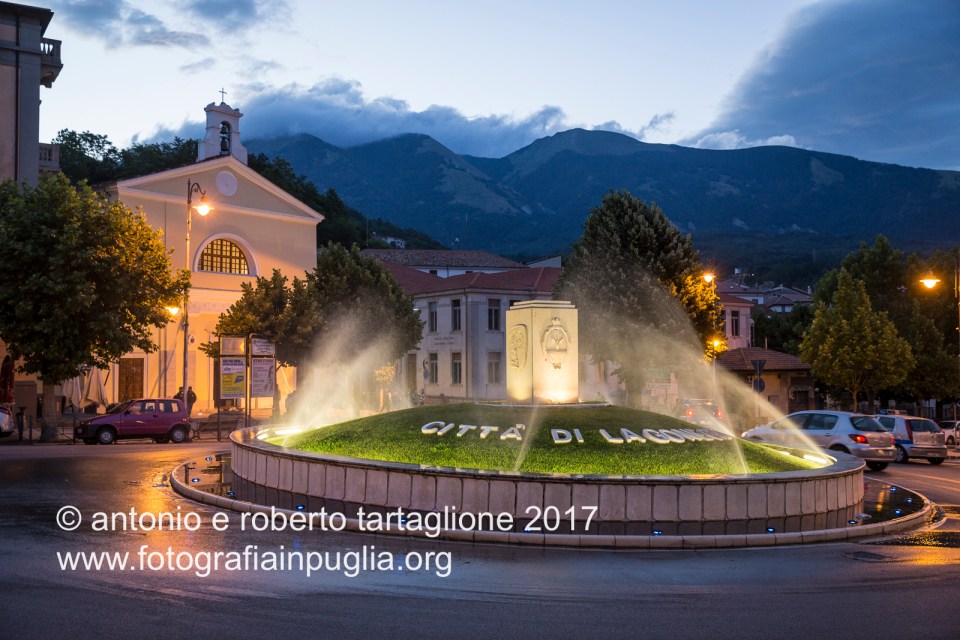 Lagonegro (PZ). la Piazza principale con il Monte Sirino sullo sfondo, la sera del 17 giugno 2017.