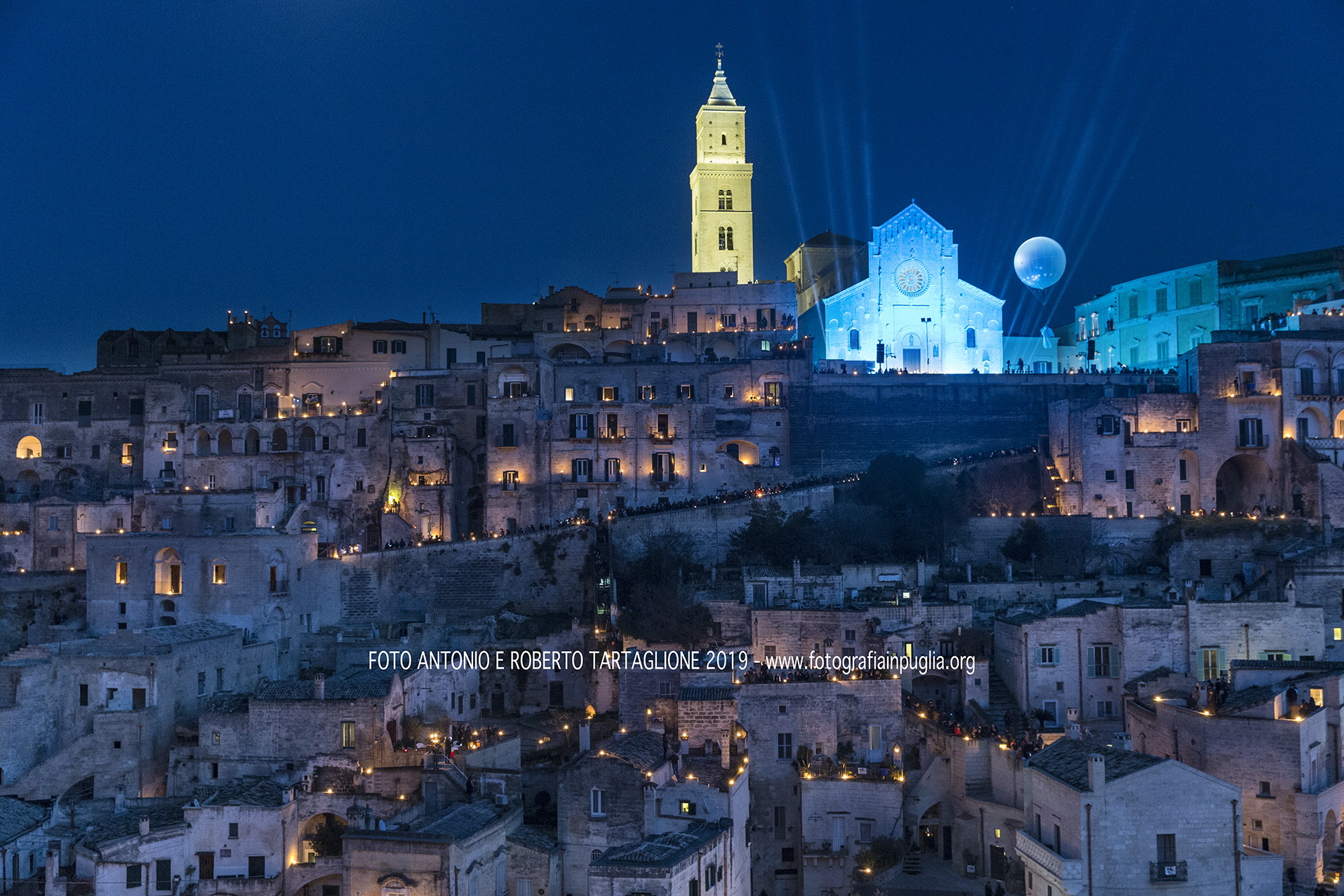 19 gennaio 2019, inaugurazione ufficiale dell’anno in cui Matera si presenta come Capitale Europea della Cultura insieme a Plodviv (Bulgaria). Al tramonto vengono spente tutte le luci nei sassi e la città è illuminata solo dalla luna e da centinaia di ceri accesi dai volontari.