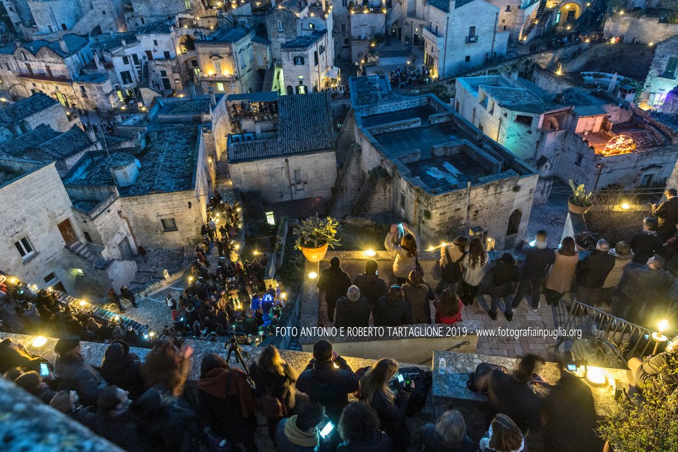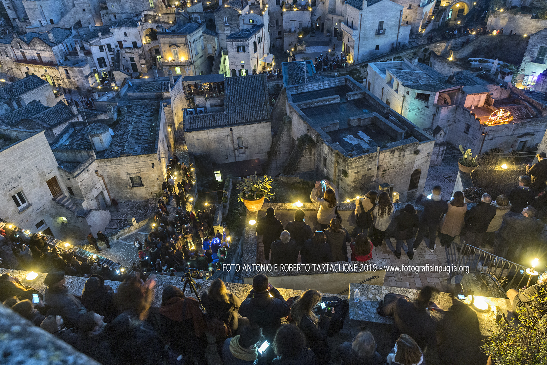 19 gennaio 2019, inaugurazione ufficiale dell’anno in cui Matera si presenta come Capitale Europea della Cultura insieme a Plodviv (Bulgaria). Al tramonto vengono spente tutte le luci nei sassi e la città è illuminata solo dalla luna e da centinaia di ceri accesi dai volontari.