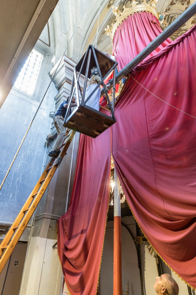 SCORRANO (LE), Chiesa della Trasfigurazione del Signore (o Chiesa Madre), mattina del 6 luglio. La discesa della statua lignea della Santa nel retro altare.