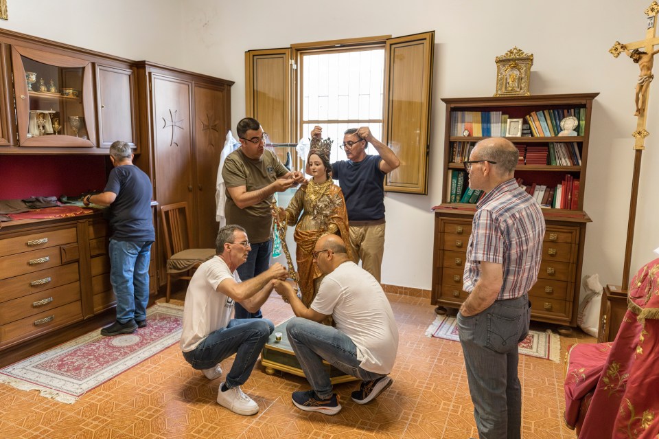 La “vestizione” della statua lignea nella sagrestia della Chiesa della Trasfigurazione del Signore.