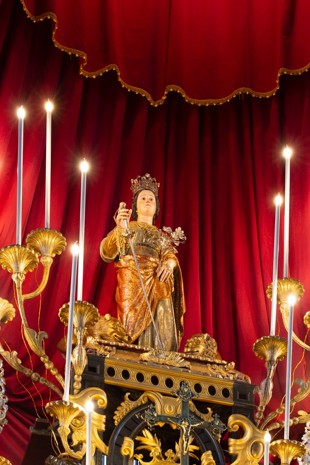 SCORRANO (LE), Chiesa della Trasfigurazione del Signore (o Chiesa Madre), mattina del 6 luglio. La statua di Santa Domenica posizionata in alto sull’altare addobbato, sotto la corona lignea.