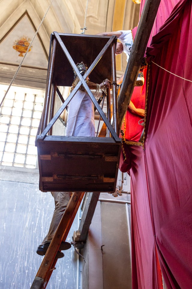 SCORRANO (LE), Chiesa della Trasfigurazione del Signore (o Chiesa Madre), mattina del 6 luglio. La discesa della statua lignea della Santa nel retro altare.