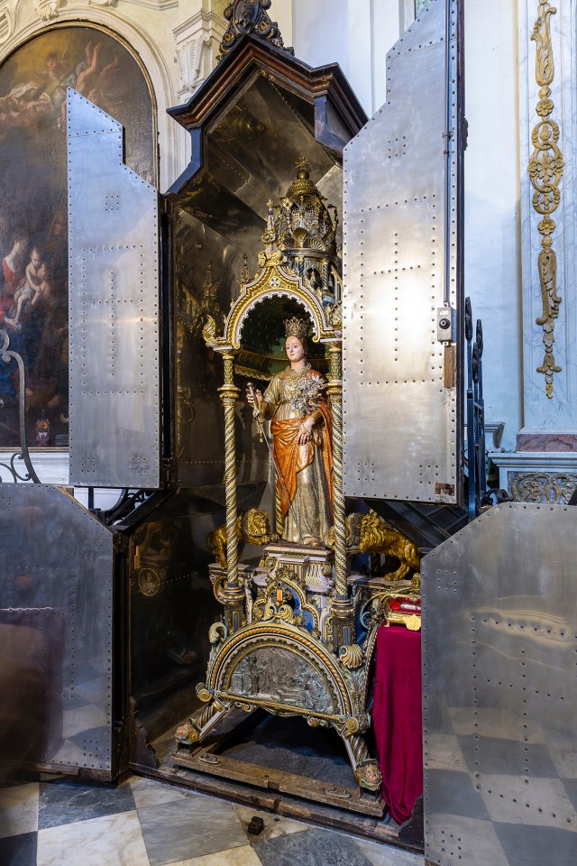 SCORRANO (LE), Chiesa della Trasfigurazione del Signore (o Chiesa Madre). La Teca con il simulacro di Santa Domenica viene aperta in rare occasioni (in questo caso per la ricorrenza di Santa Lucia il 13 dicembre 2023)
