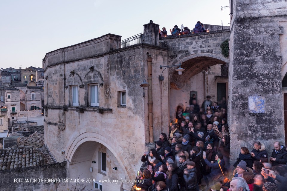19 gennaio 2019, inaugurazione ufficiale dell’anno in cui Matera si presenta come Capitale Europea della Cultura insieme a Plodviv (Bulgaria). Al tramonto vengono spente tutte le luci nei sassi e la città è illuminata solo dalla luna e da centinaia di ceri accesi dai volontari.