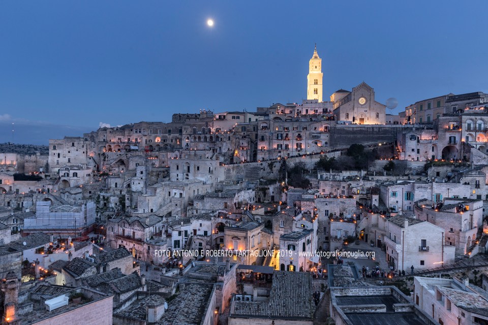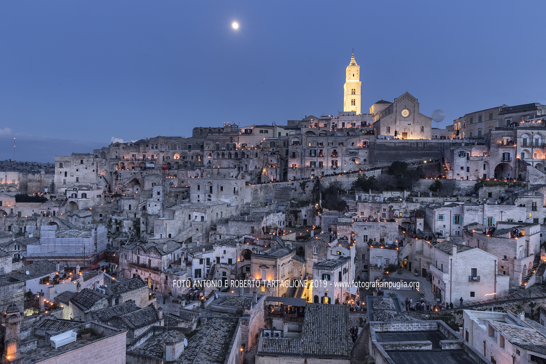 19 gennaio 2019, inaugurazione ufficiale dell’anno in cui Matera si presenta come Capitale Europea della Cultura insieme a Plodviv (Bulgaria). Al tramonto vengono spente tutte le luci nei sassi e la città è illuminata solo dalla luna e da centinaia di ceri accesi dai volontari.
